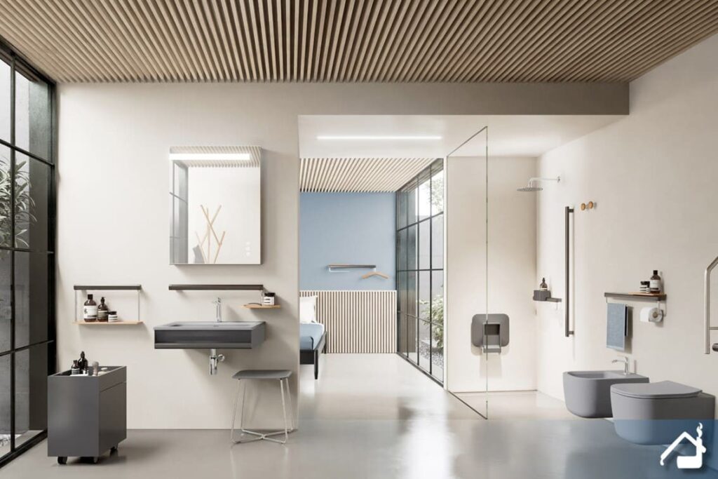 - HELP SYSTEM: una serie di pulsanti per la richiesta di aiuto che, installati direttamente sui prodotti della collezione o sulle pareti, attivano una chiamata verso un numero telefonico predisposto rendendo possibile una conversazione in vivavoce. La centralina, collocata nello specchio, viene gestita tramite una APP semplice e intuitiva.
