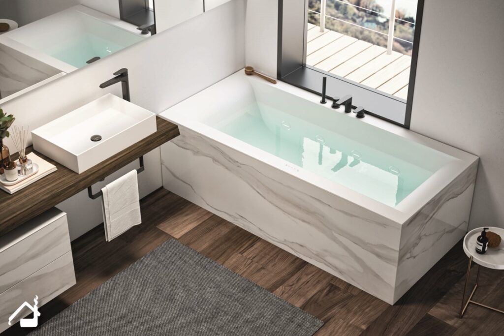 - Fascino intramontabile ed eleganza del Bianco Calacatta che si estende alla vasca idromassaggio Rio, creando un effetto materico unico e trasmettendo una sensazione di armonia degli elementi all’interno dell’ambiente.